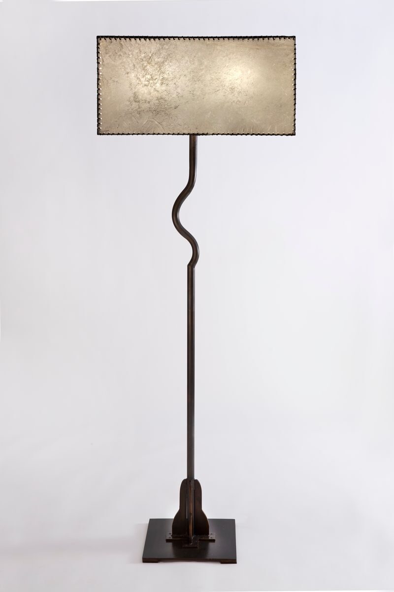 Blackened bronze with goat skin shade hand laced with buckskin Measurement. 64 inches high Shade 23”wide x 10” deep x 10” high